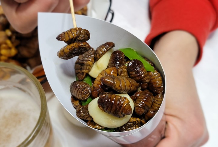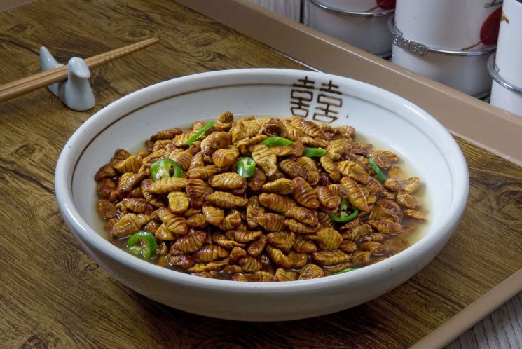 바삭바삭한 번데기를 채소와 함께 내놓습니다. 이때 다양한 채소와 함께하면 영양도 높이고, 식감도 다채롭게 즐길 수 있습니다.